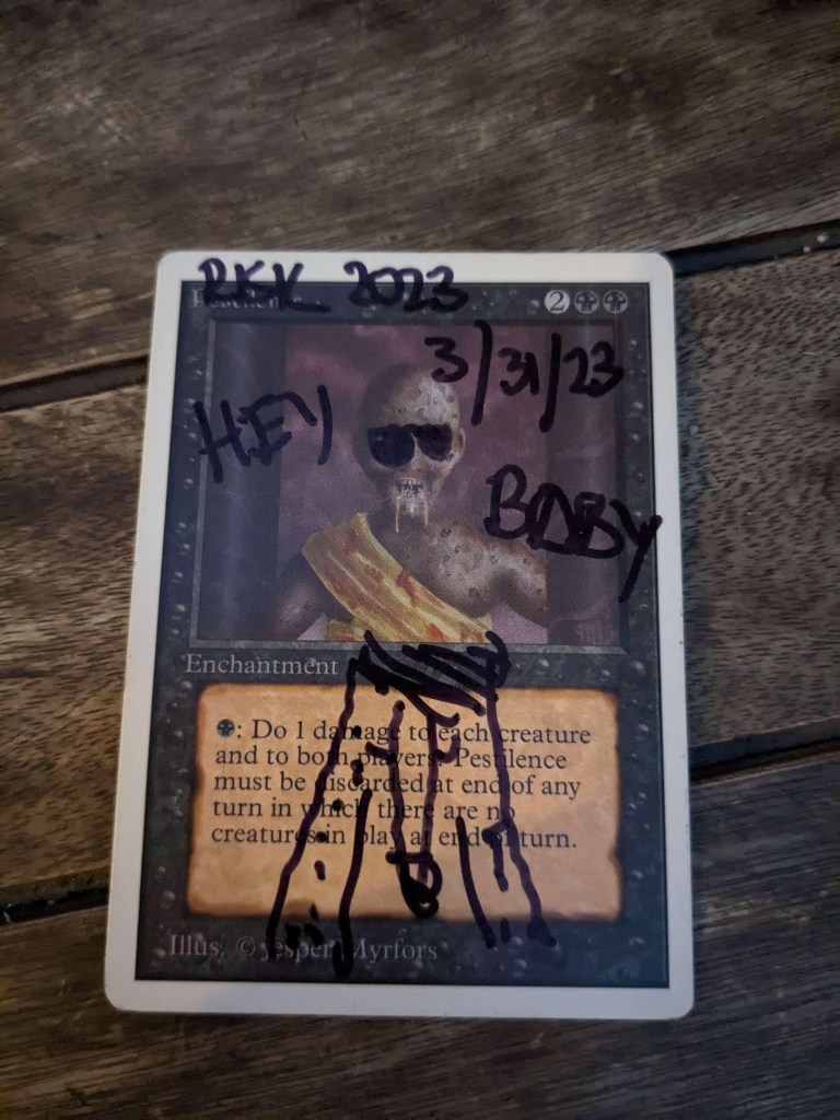 Once we finished lunch, I headed back to my room and picked up Kelly. We returned to the patio for the Friday evening event on the patio and Chris Pepin’s baby Scribble Ante. 60-cards unsleeved and Posca markers ready. I was about to let my opponents draw more cards than they could imagine as I was playing black/red Dreams. Unfortunately, two copies of my Underworld Dreams did not make it, and I had to substitute them with some less useful black cards I found in my backpack. Games were lost games were won, and ink was laid down on both sides. My most notable game was against 14-year-old Rikki Norris, who will undoubtedly be one of our successors in 93/94. Rikki was packing mono-green thallids. A similar deck to the one I played at mono green in the woods at the 2022 Chalice weekend. It was a close game as she swung in with an army of 1/1 elves and thalids casting double Giant Growth on a Llanowar elf. I eventually won the match with Contract from Below, backed by Underworld Dreams, passing the turn to Black Vice damage. All in all, it was a great first night. I called it a night around 1 am and headed to my room.