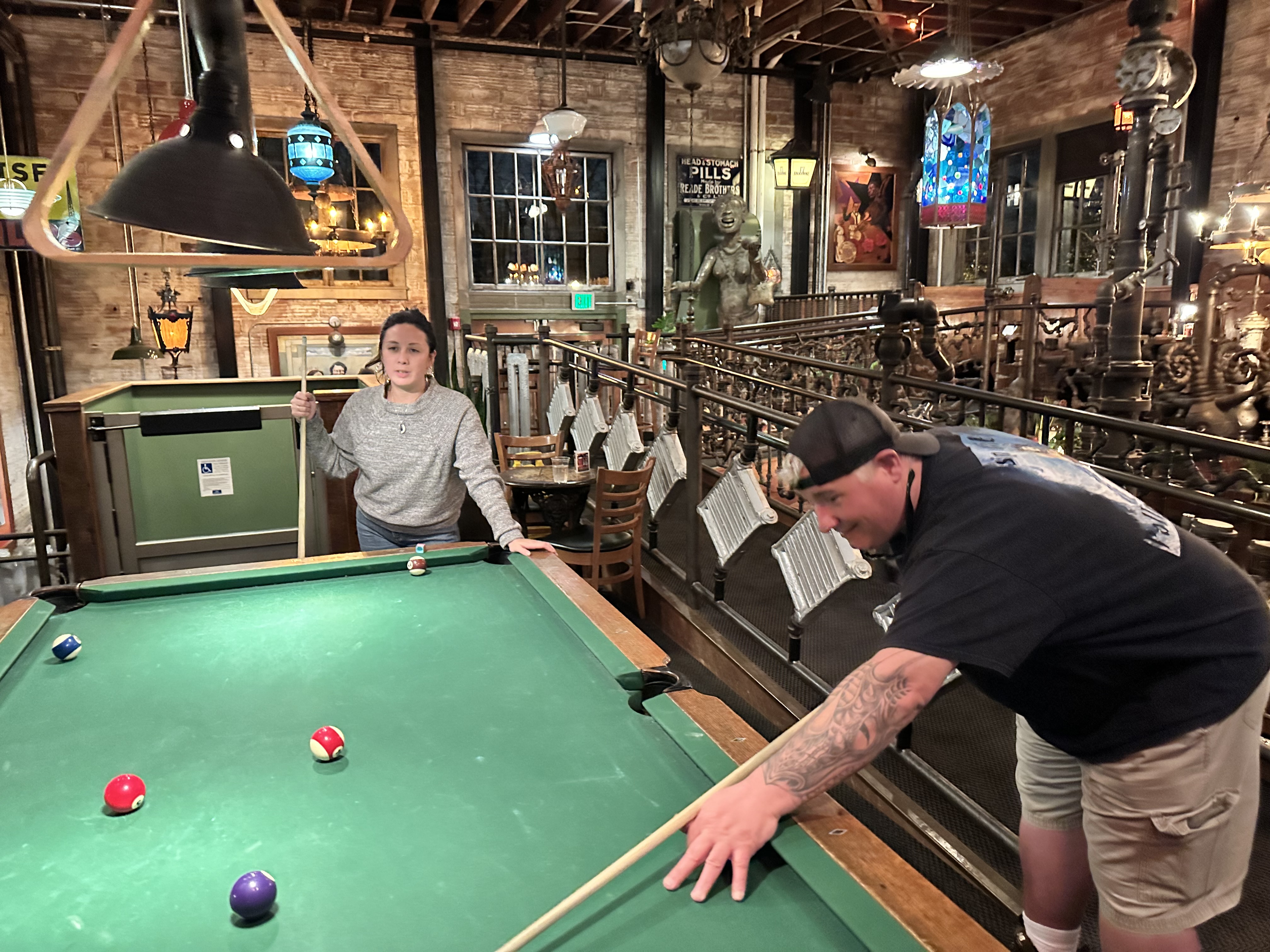 We quickly arrived at Kennedy School and as I waited for Brian to check in, I immediately started googling to find out just how haunted this building was before I wandered off to help some kid find their parents who have all been dead for 50 years. Not to my surprise, the building is said to be extremely haunted and to have extraterrestrial sightings from time to time. Shortly after arriving, Kyra Sacdalan and her sister picked us up and we ventured to Mox Boarding House for an afternoon of Old School games and cocktails. For those who have never experienced this, it’s an LGS but on a whole other level. The bathroom reminded me of Harry Potter and the Chamber of Secrets with the circular sink between the restrooms. The bar in MBH is on par with a top-shelf bar in Vegas maybe better than most. if you’re a fan of old fashions it was one of the best I’ve had to date.