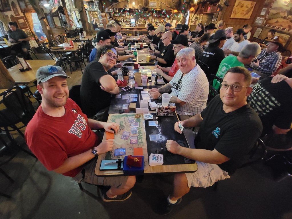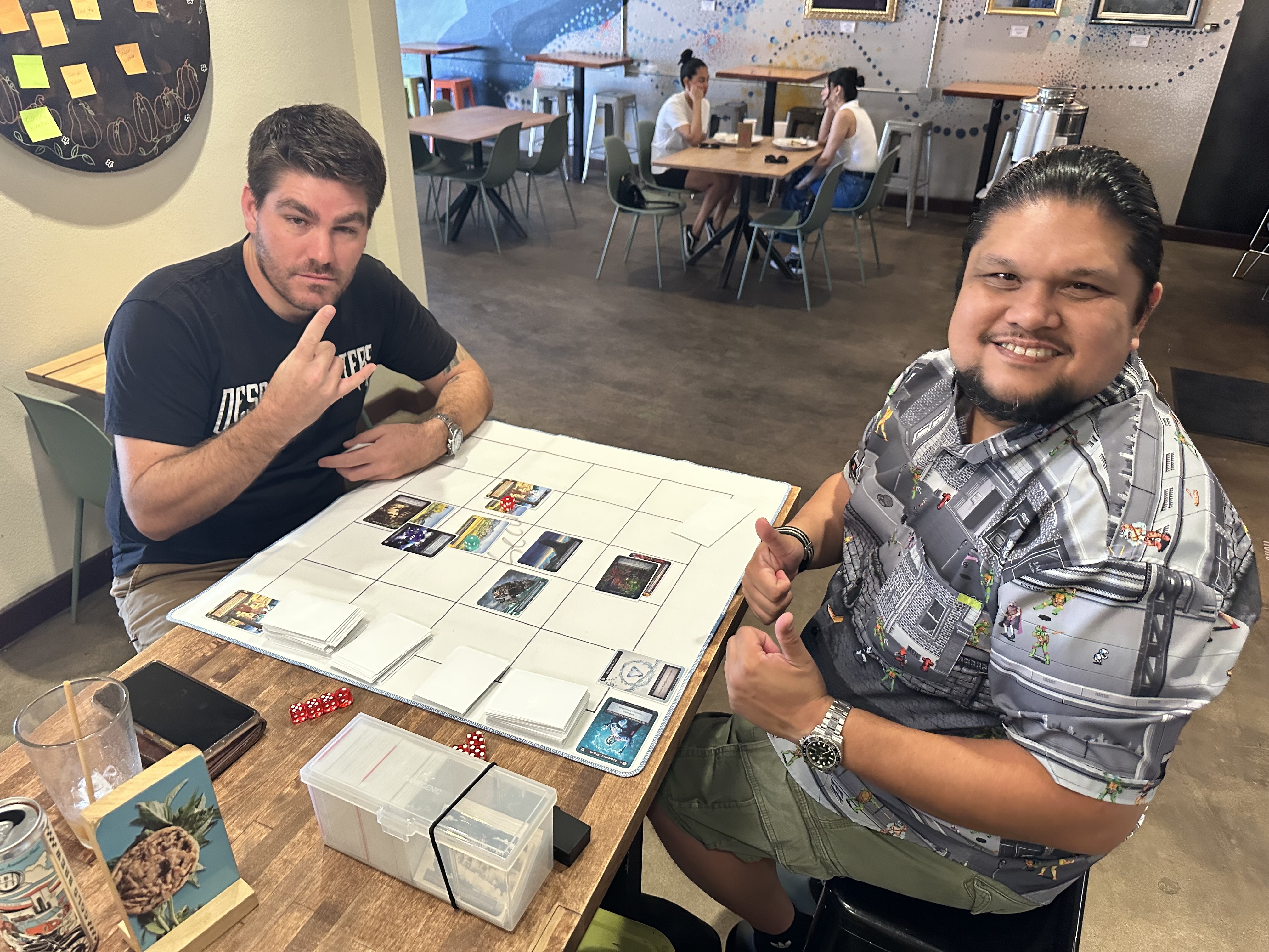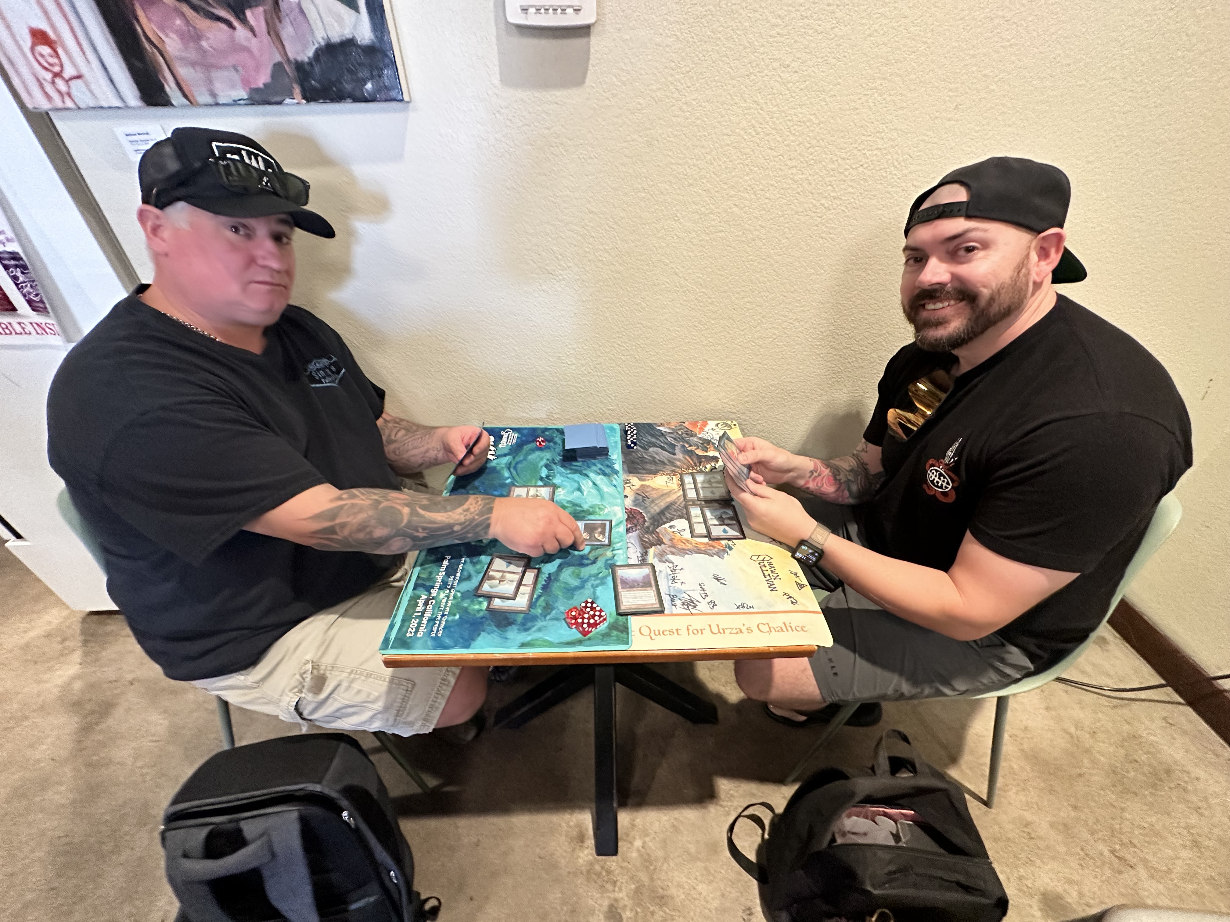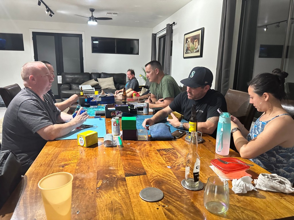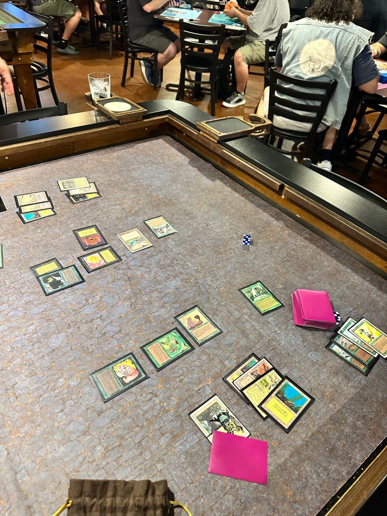 I met with Justin, Brain Vegso, and Brain Urbano at The Crepe Café for breakfast. The Chorizo burrito Crepe was outstanding if you like Mexican food. Once I arrived, I noticed Coffey and Urbano were playing a newer game I’d heard of but have yet to see being played, Sorcery. I will only get a little into this, as this game looks dense, and I still have no idea what I was watching, but it looked interesting. From what I gathered, there were four zones, multiple battlefields, and ways to engage with permanents. I’m open to trying Sorcery if anyone has this at Chalice and wants to teach me. Adam Lipinski from Neos showed up to breakfast also. It’s always awesome to get to meet people you talk to online in person. After a few hours, Justin and I took off and snatched up Mox Emerald Scott from the Emerald City Trolls and Andy Swaffar from the Houston Falling Stars at the airport. We had time to kill after picking up the crew from the airport. We went to Justin’s place, where we all caught up over a couple of beers, before heading out to the Silver Key Lounge for the special Friday event, 7-Point Singleton, where get ready, Chaos Confetti was legal!