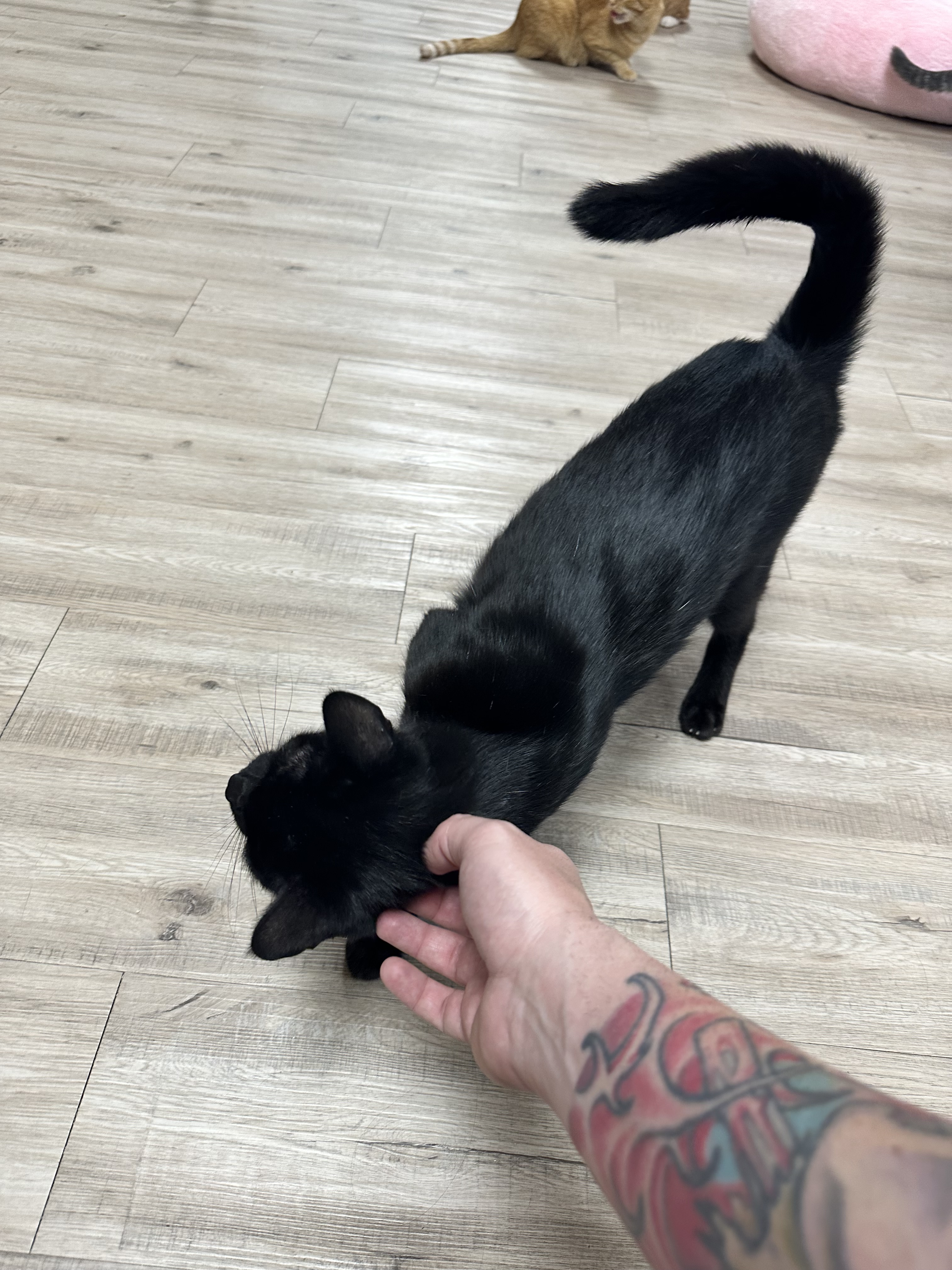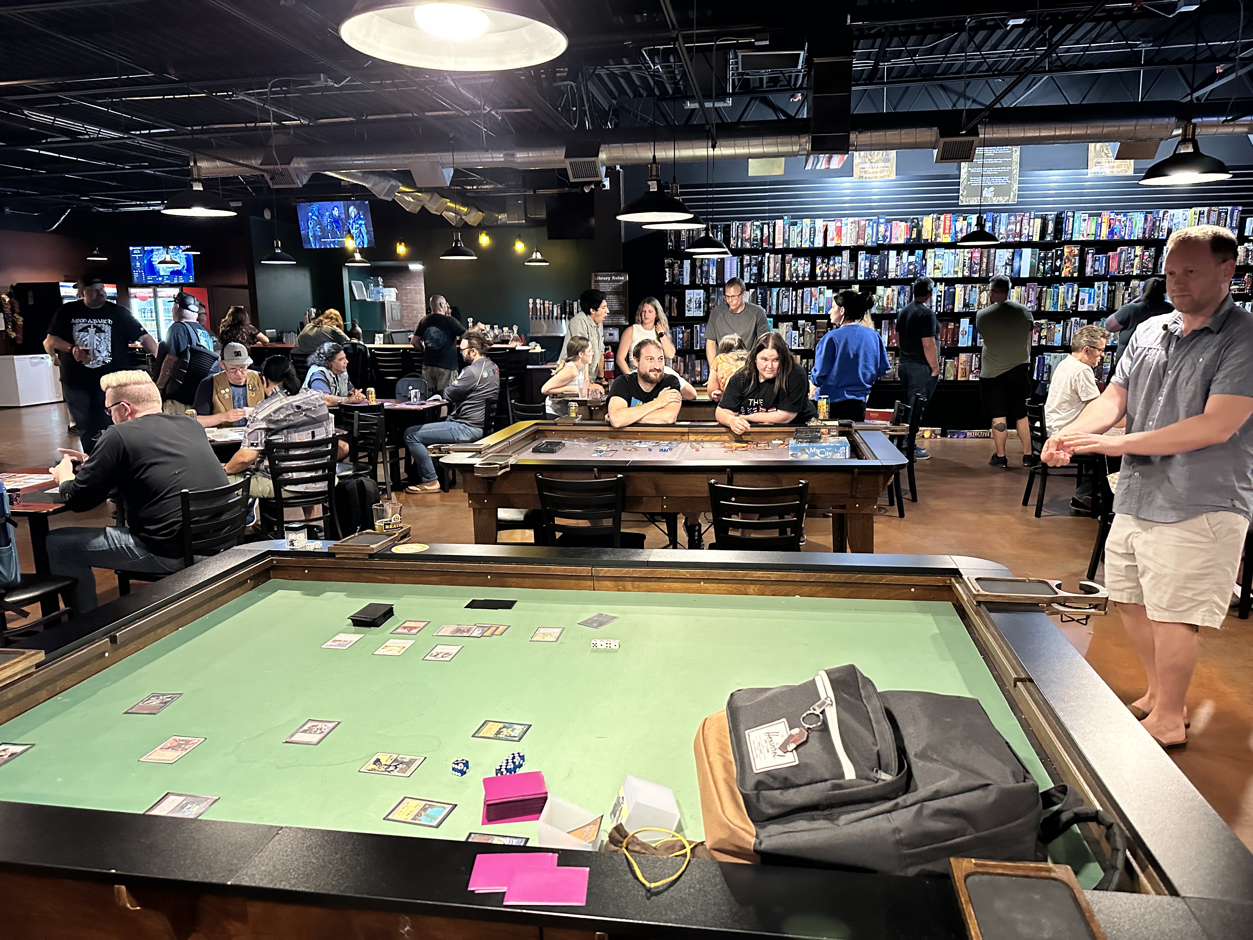 Never playing 7-Point before, I wanted to go with something simple so I didn’t have to think about it too much, as I planned to chill and drink with the homies. I decided on a Mono Green build just to cast big creatures and deliver even bigger beats. The 7-Point event was very relaxed. You just found an opponent, played a single game, and moved on to the next, trying to chalk up as many wins, or in my case, beers and losses as possible. I went 3-3, so it wasn’t all losses, just half the time. My favorite play of the night was letting my opponent attack me and not blocking with my only creature, Lurker, bringing me to 1 life. My opponent attempted to kill Lurker with removal, but due to me not blocking, Lurker had Hexproof. My opponent, seeing this, realized he was at two life, and his blocker was useless as I had Sword of the Ages on the battlefield. I untapped and sacrificed Lurker for the W. In my best Borat voice, I said, “Very nice, great success!” I only got to rip up three Chaos Confetti throughout the night, and if you saw Mox Emerald Scott’s video on Instagram, I threw a big chunk into my beer. But the best part of the evening was when I went out to get pizza halfway through the event and stumbled into a CAT CAFÉ! If you know me, you know I have two giant cats and would own all the cats if I hit the lottery. I hung out and played with cats for about a half hour. After the event and paying my bar tab, I called it a night and caught a ride back to the hotel with my fellow Fallen Angel club member Brian Vegso.