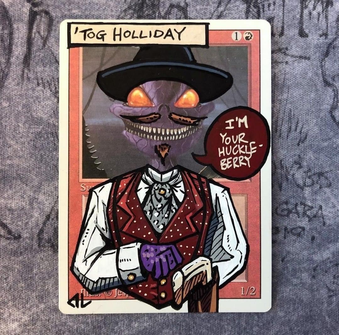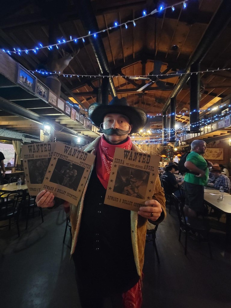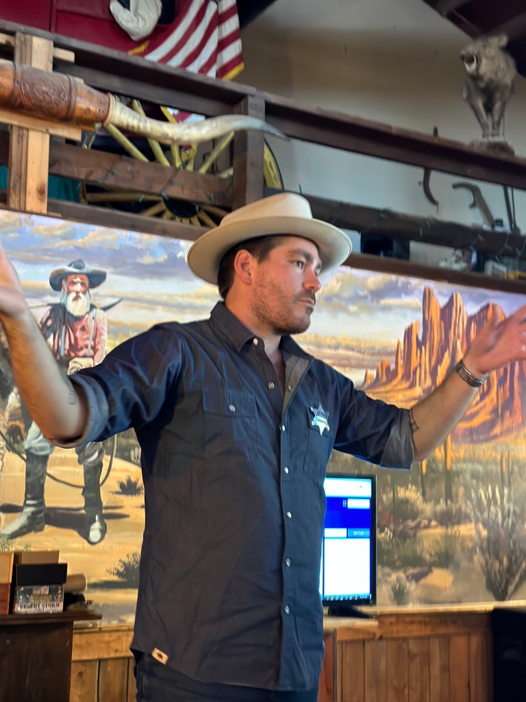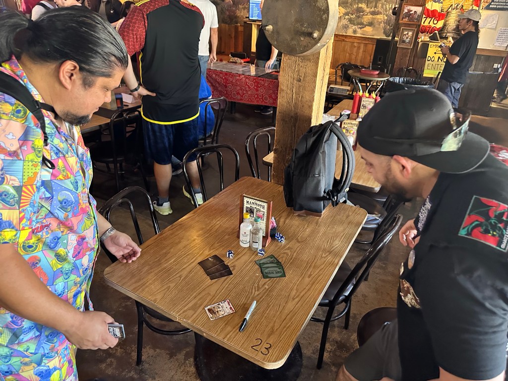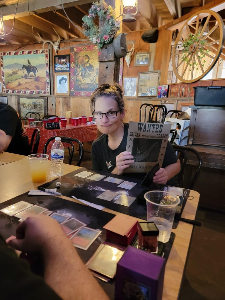 On the main event day (The Showdown at High Noon), my weekend roommate Andy and I caught breakfast at a local spot, Wildberries, in Mesa, AZ. After both being sold on the Biscuits and gravy, we sat and shared our love for the era of the set Apocalypse and the nostalgia that came with it. After breakfast, we had to run by the tattoo shop before heading to the main event as I forgot my ID there on Thursday night. The Main event was held at the Mammoth Steakhouse in Goldfield Ghost Town, and we were welcomed by the bartender, who, to this day, I believe was in the witness protection program, like Christopher Walken, who plays the ex-mafia boss now School Janitor “Clem” in Joe Dirt. Yeah, it was that, but it was even more comedic than the movies. Round one started very promptly. I won the dice roll, opened with Land, Mox, and Black Lotus, tapped Mox to play Black Vise, and sacrificed Black Lotus into Blood Moon GO! My opponent was on Atog, which slowed him down enough for me to get the needed wins. Round two was against Mono Black, and the massive amount of land destruction backed by Bolts, Chain Lightning, and Black Vise won me a quick 2-0. Round three, I lost my ass to Ernageddon. The GW deck runs too many mana-producing creatures, and land sources for even my Ponza build for the event. The next three rounds were a blur with the combination of the alcohol and heat from being in a poorly air-conditioned western bar (on par for the theme). Still, I know I lost two of the three, and in my last game with Joseph from the Desert Twisters, we’ll call a cooperative draw even though they don’t exist in Old School. If you want to know that story, you’ll have to ask in person.