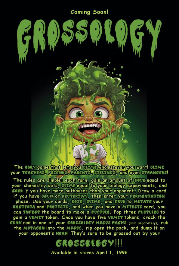 A: I like humor and satire. I think they are a great way to poke fun at how things were back then and really help foster the nostalgia we were aiming for. So, it was important to me to make some fun ads to include. 1-900-KILR-DEK calls back to the ridiculous, exploitative 1-900 numbers of the 90’s. Grossology is typical of an ad for a hastily thrown-together game created by a bunch of marketing suits aimed at a youth audience they really had no clue about others, seeing that they would throw lots of money at gaming hobbies. Even More Fucking Legends points at the shoot-from-the-hip, let’s-figure-out-wtf-we’re-doing vibes Wizards exuded the first few years. Not to mention the OS in-joke about there being new cards from Legends constantly. Chaos is an aborted card game I started designing in the 90’s, the cards for which I found in my childhood closet over the summer. Shivan Hoard is an ad from a random (fictional) game store in Akron, OH, with a not-quite-there understanding of how to make a compelling ad. I remember seeing random game store ads in the 90’s, and both feeling interested in figuring out how to go to one while also wondering why they were advertising their little store in a national hobby magazine. This ad also has a few Easter eggs for careful readers. The pizza ad started with a real ad from the 90’s, clearly just thrown into the magazine by a big brand who has found a channel to their target demo with a bland tagline in the top right. Also, you can’t just print a magazine with whatever number of pages you want, so the ads padded out the zine to be a printable length.