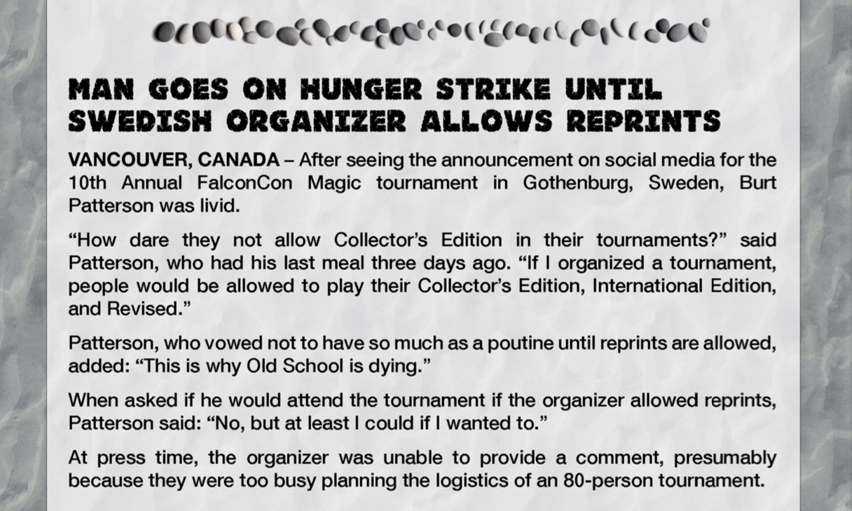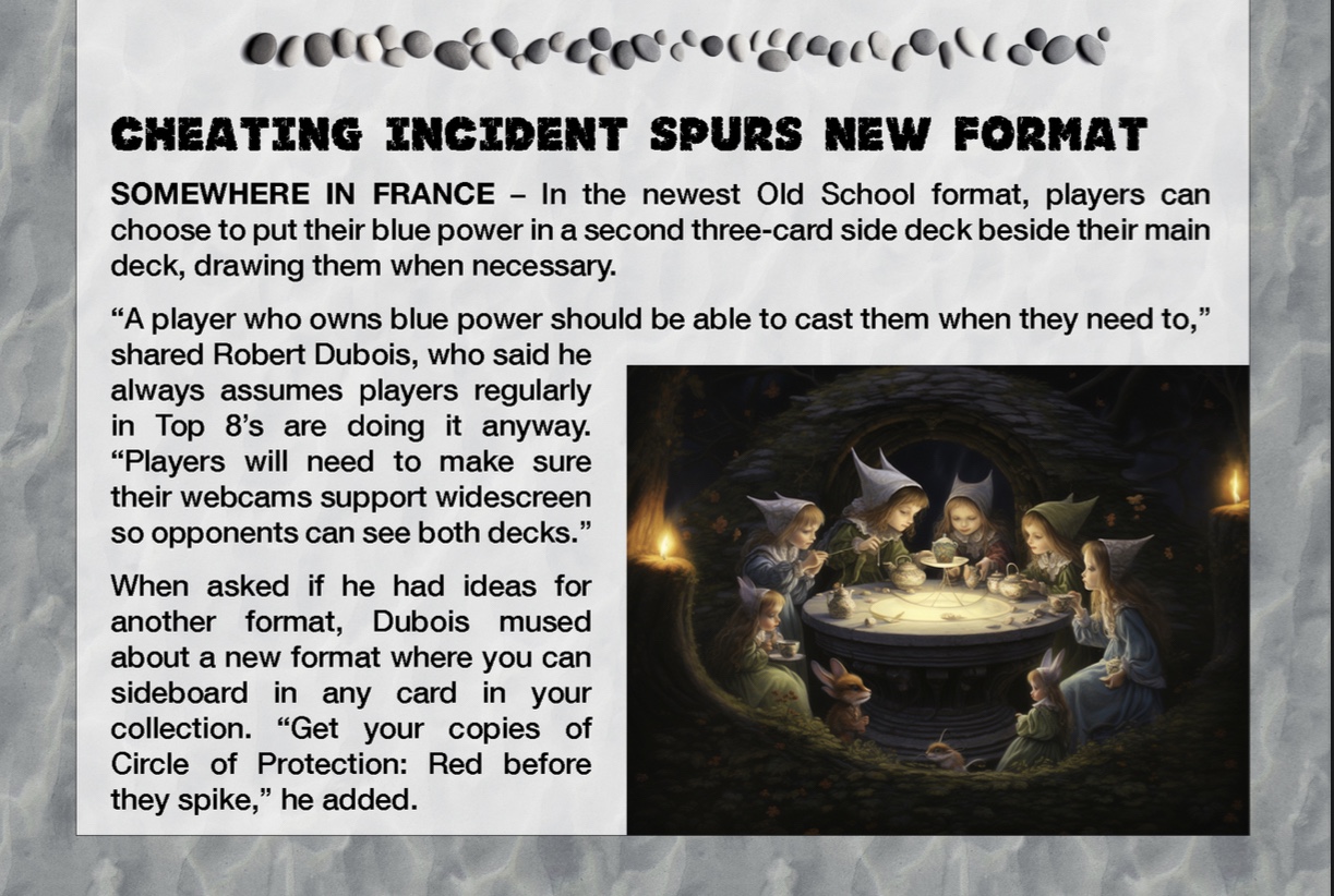 A: I intended it to be more or less like the Duelist and have all the components of the big magazines from the 90’s, instead of something more like a fanzine (which are great! props to the people making those). A few recurring columns (The Rumor Millstone, Banding/Something with DFB, Magic: the Puzzling), plus some one-off ones. At least one piece of fiction and one spikey strategy piece per issue. Some ads. And then just whatever people want to write. We brainstormed a bunch of ideas, and then people picked things they wanted to write about. One thing I hope we can get in the future that no one picked up was interviewing an artist. Those kinds of pieces were always really fun back in the day. But it’s a lot of work to do a good interview and can be intimidating.