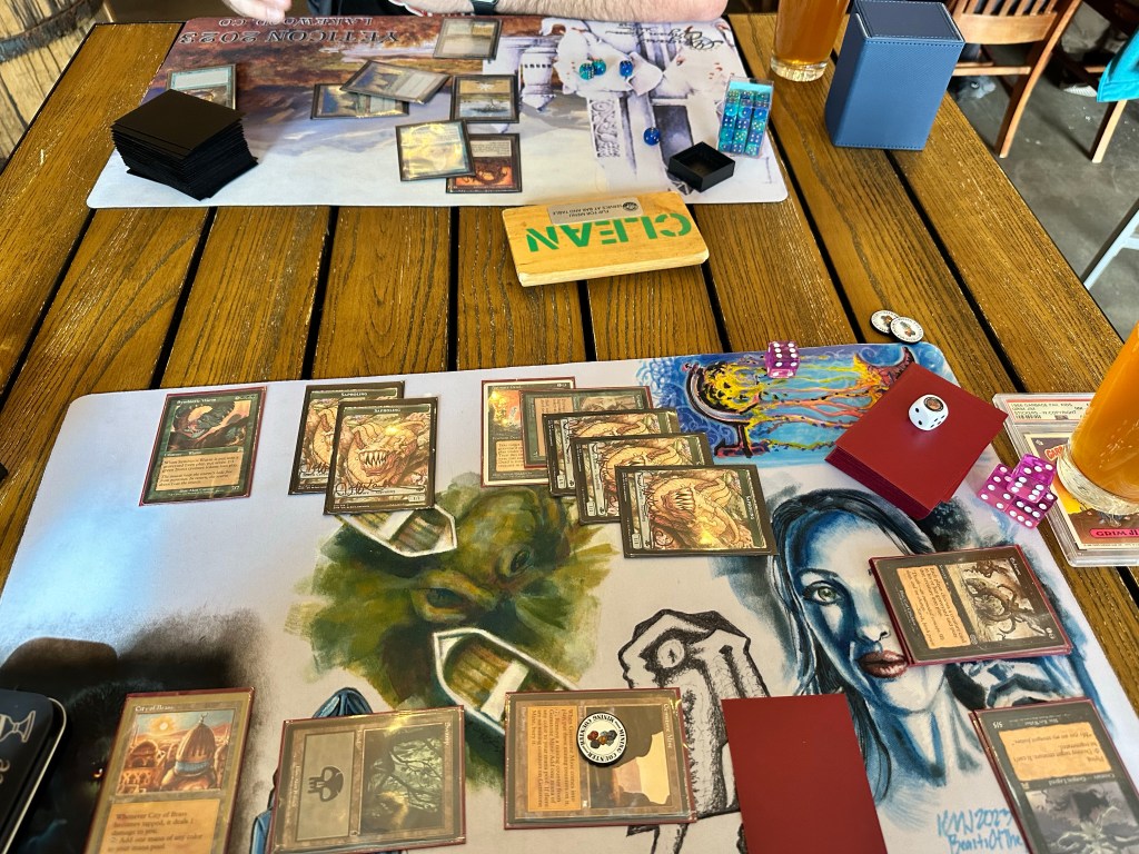 After breakfast, we checked into our hotel, dropped our bags off, and drove to Green Mountain Brewing Co., where the 2023 Yeticon was held. Jared Miller went all out on the swag for Yeticon 2023, and for the $75 entry fee, it was one of the best event swag bags I have seen. This bag was loaded with a playmat, stickers, a Yeti pin, Old School Pogs (yes, you read that right, POGS!), cards, and a drink ticket! Brandon designed the playmats utilizing Margaret Organ-Kean’s Ivory Tower art with a random Colorado seasonal background, and you did not know what season you got until you checked in with Sara Miller, who did an outstanding job running the event! Oh, there was also a full table of snacks. I headed to the bar to order a beer for myself and Joe Nash, aka Yeti from The Beasts of the Bay, and we caught up on life before the first round of the 93/94 event started. Round one pairing went up, and my fellow clubmate Brian Vegso and I were paired against each other. It took a blazing 8 minutes for us to finish our games, as we were both on identical builds of Power Monolith. Brian had a better draw than me and got the 2-0 finish. We decided to grab another beer and go out on the patio, enjoy the beautiful Colorado weather, and play games of Sorcery until round two. In the next three rounds, I pulled a quick 2-0 finish on my opponents. We took a lunch break after round two, and just as Jared knocked the swag bags out of the park, he followed it up with an even better lunch: A full BBQ spread! The meats were delicious, but that Macaroni and cheese with the bacon on top was primo!