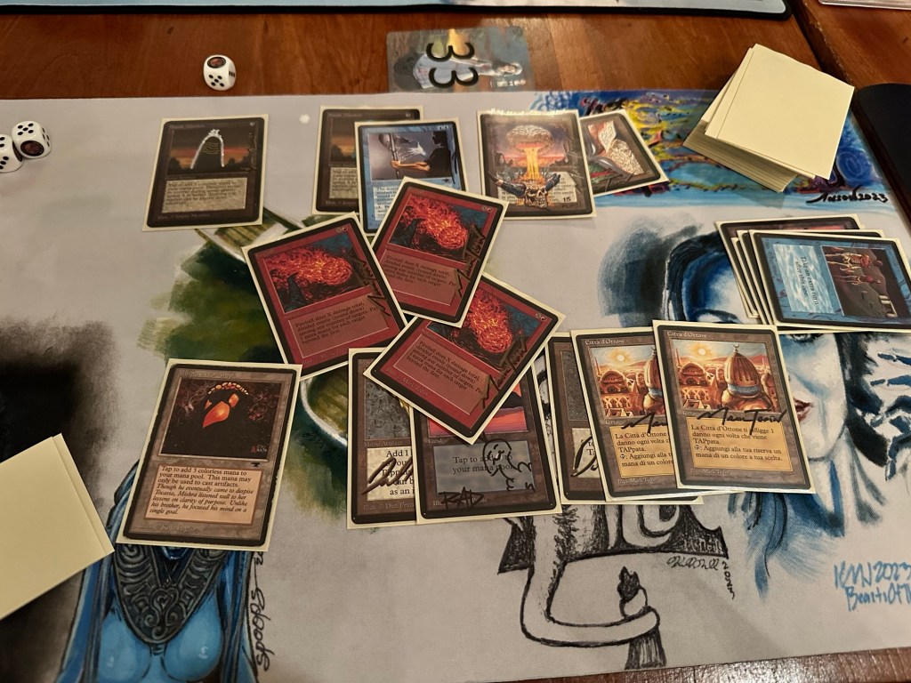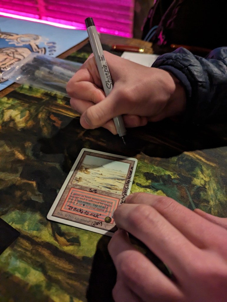 Round four was much of the same. Ivan Bari was on Mono Red Power Surge and Blood Moon strategy, and with the lack of Mishra’s factories, I had no outlet to sink Mana into dealing with Power Surge. I lost 1-2. In round five, I was going for the “Last Place” award and informed my opponent, Ryan Keach, who played Guardian Beast Rocket Launcher, that he better beat me. I won 2-0. Round 6 was another Mono Black matchup with some spice, but fast Hippies are hard for Power Monolith. I lost 1-2. This was my worst-ever record since I started playing Magic: The Gathering, but I had a great time sitting at the bottom table since everyone was having fun and didn’t care about their records anymore.